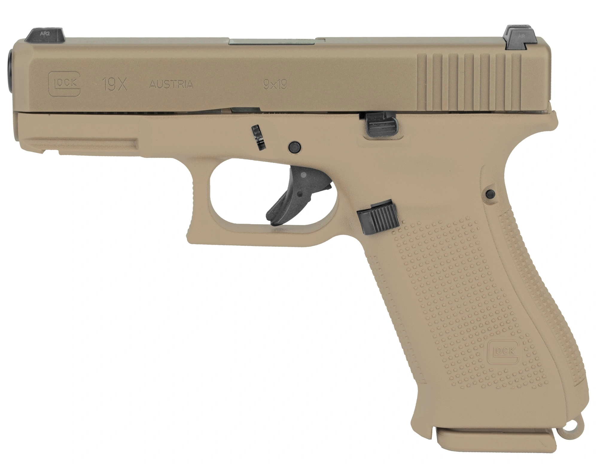 GLOCK 19X je kombinacija kompaktnog okvira GLOCK 19 i duže cijevi GLOCK 17, dizajniran za vojne i taktičke potrebe. Ovaj pištolj dolazi u jedinstvenoj boji, sa obostranim prekidačem za zatvarač i bez prednjeg udubljenja na okviru. Opremljen je Marksman cijevi (GMB) za veću preciznost i koristi Safe Action® sistem za sigurnu upotrebu. Kalibar je 9 mm, a nudi visoku pouzdanost i performanse.